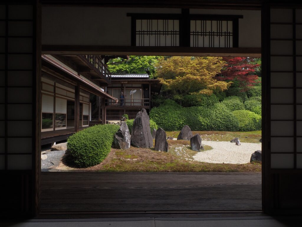昭和の名作庭家・重森三玲が手がけた枯山水庭園「波心庭」が有名で、白砂と苔、石組みが美しく調和し、秋には紅葉と苔のコントラストが「虹の苔寺」と称されます。