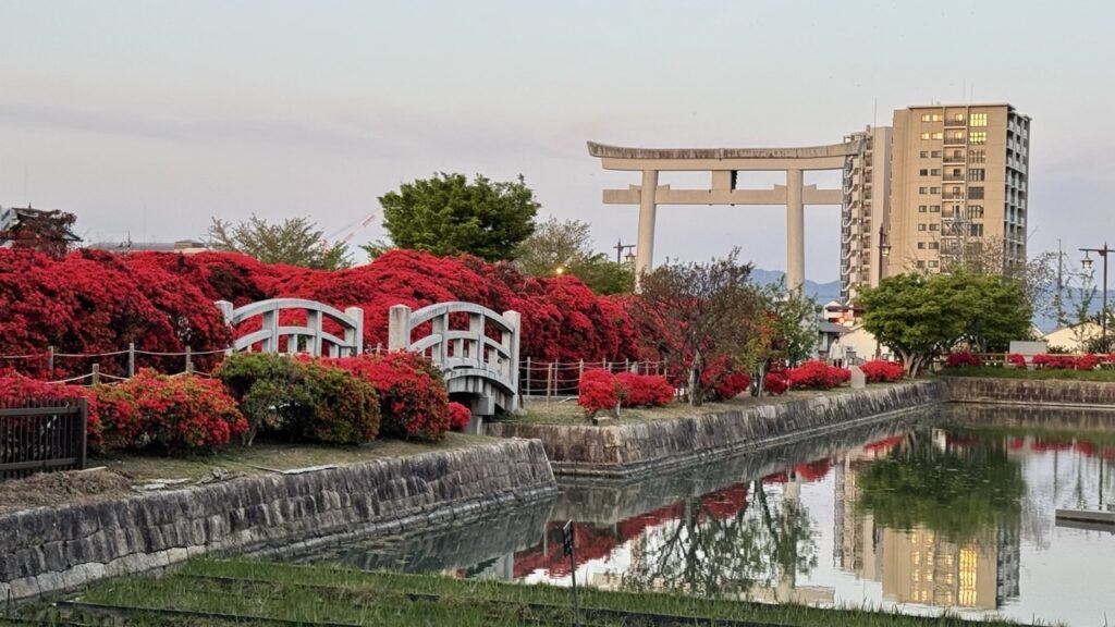 おでかけ京都2025年4月27日長岡天満宮「キリシマツツジ」 桜の季節が終わったあと、「キリシマツツジ」が綺麗な時期が訪れます。八条ヶ池の中堤沿いに約100株、樹高2.5m・樹齢170年ほどのキリシマツツジが植えられ、4月中旬から下旬にかけて真紅の花が咲き誇ります。その美しさは市の天然記念物にも指定されています。キリシマツツジは、名前のとおり、鹿児島県霧島山が原産で1640年代に、大阪、京都、江戸へと伝わったそうです。2025.4.21