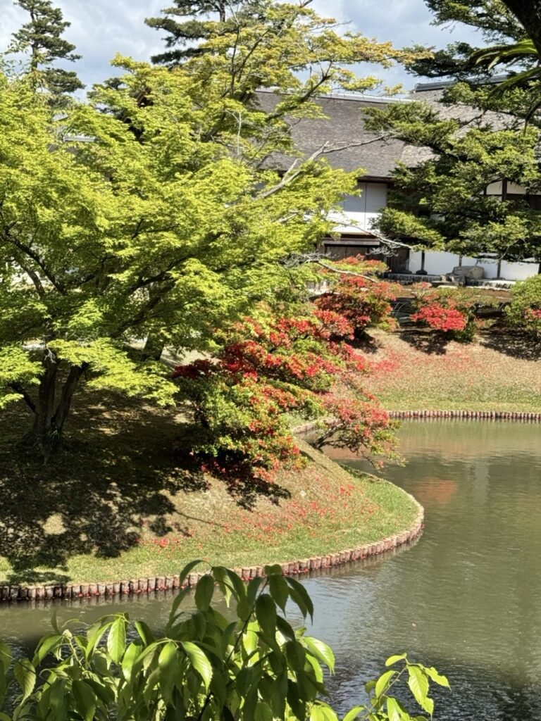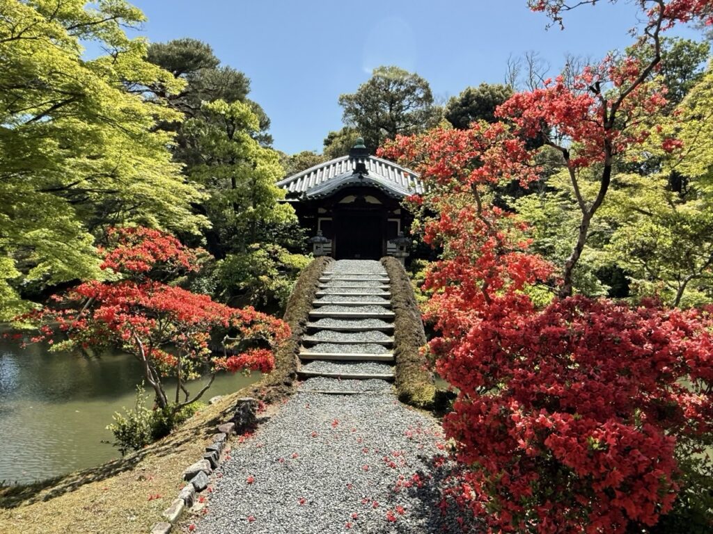 おでかけ京都2025年5月3日桂離宮とキリシマツツジ 桂離宮は日本庭園の傑作として知られ、春から初夏にかけて咲くキリシマツツジが特に美しいことで有名です。賞花亭周辺に多く植えられており、御殿を背景にしたツツジの景色は人気の撮影スポットです。2025.4.29