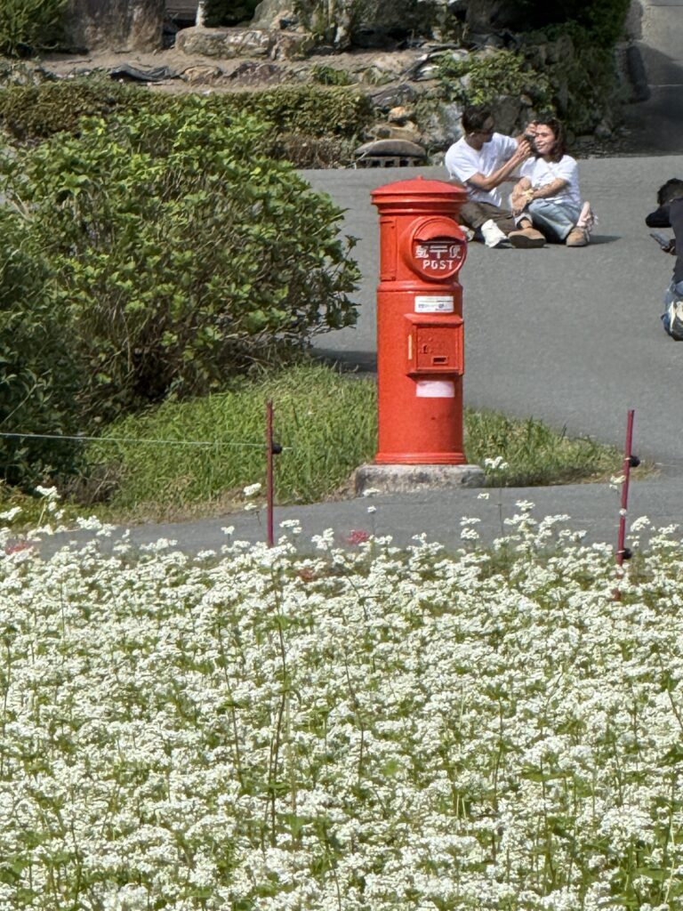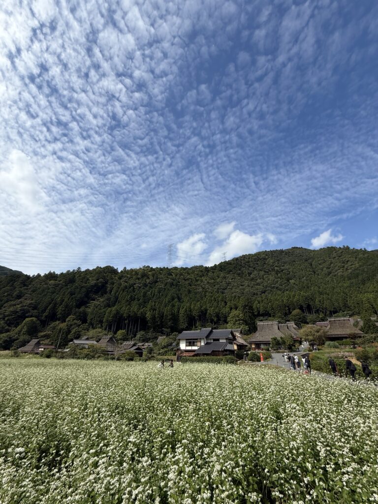 畑には夏はひまわり畑だったところが、今は蕎麦畑になっており、白い花が咲いています。