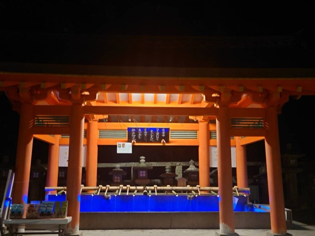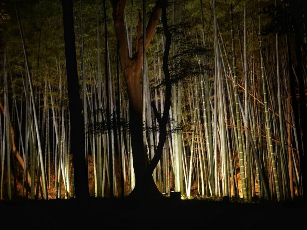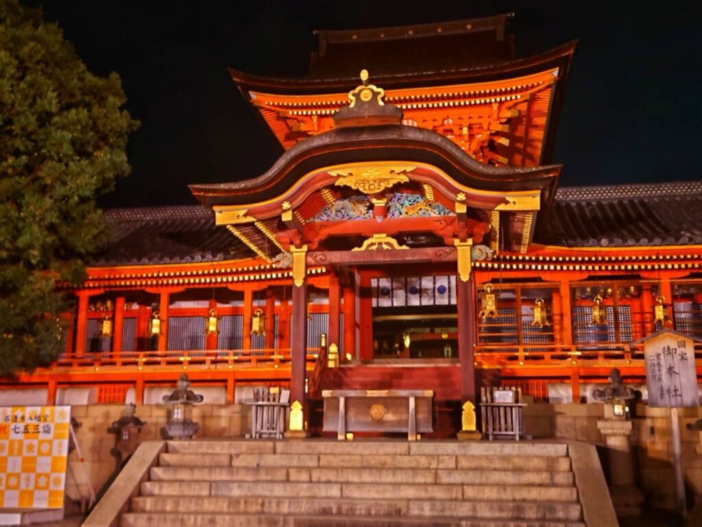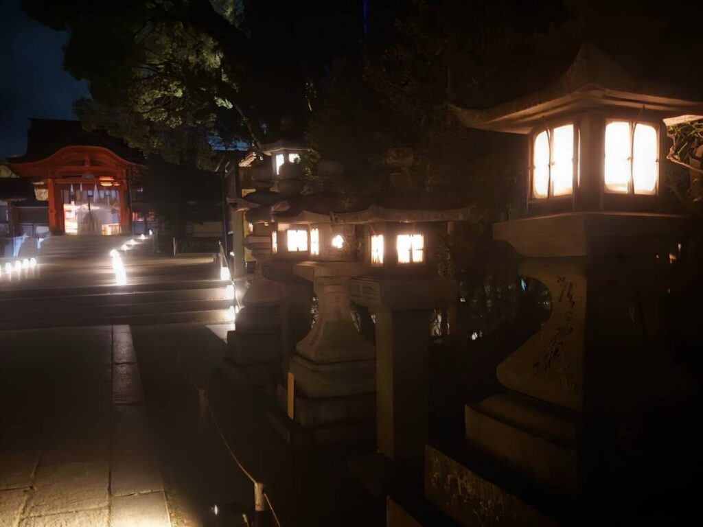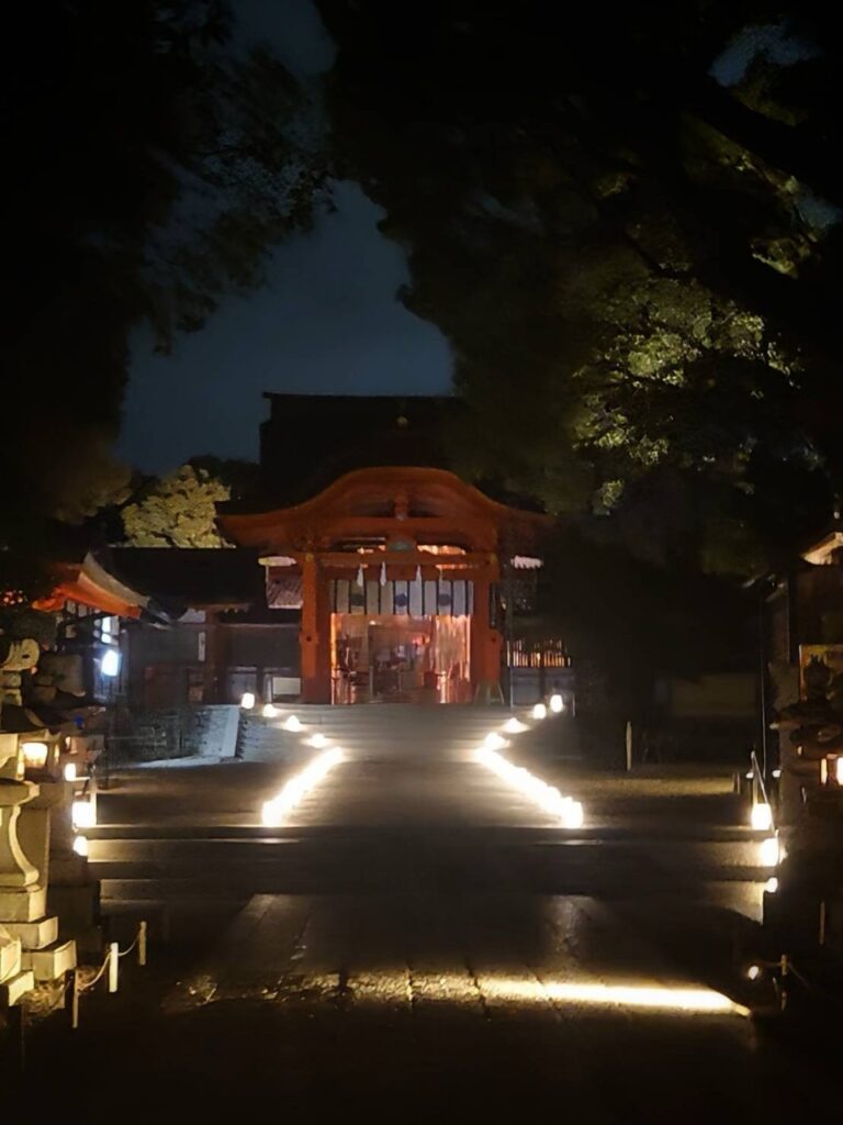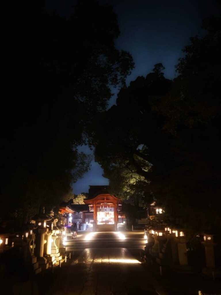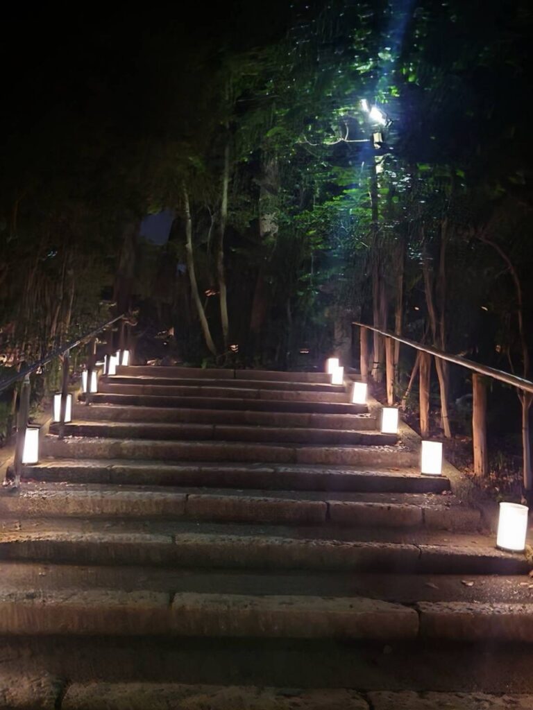 八幡市の国宝・石清水八幡宮を舞台に2025年10月11日(土)から13日(月・祝)まで開催される夜間ライトアップイベント。期間中は午後6時から8時半まで境内が特別に開放され、本殿や参道、男山展望台にかけて幻想的にライトアップをされていました。