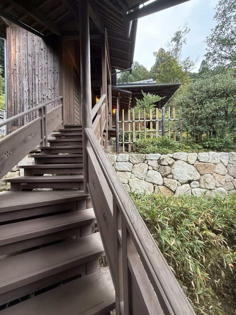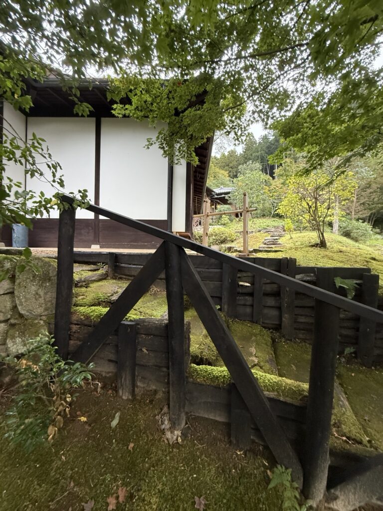 囲炉裏のある部屋の窓側からスリッパを借りて庭を通り階段を登って進みます。現地ではガイドさんもおられて色々な見所や解説をして頂けます。