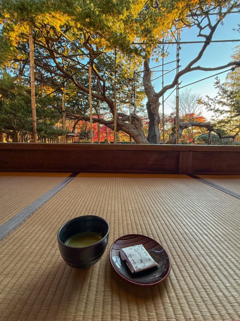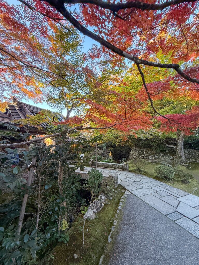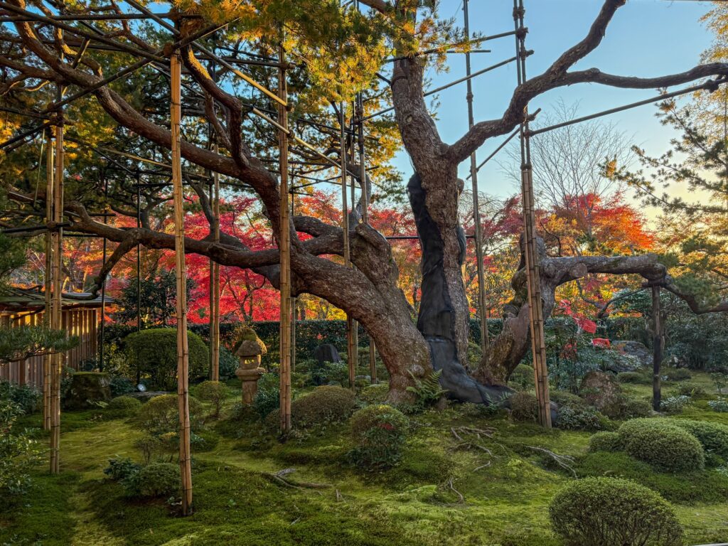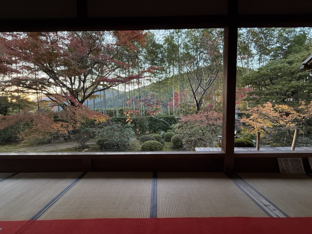 夕暮れ間近にギリギリに到着。この季節、お部屋から五葉松や竹を背景に夕陽と合わせてとても綺麗に見ることができます。2025.11.15