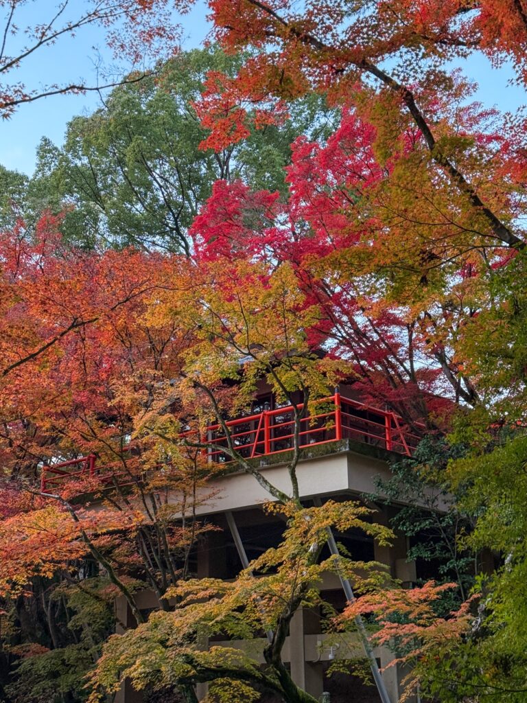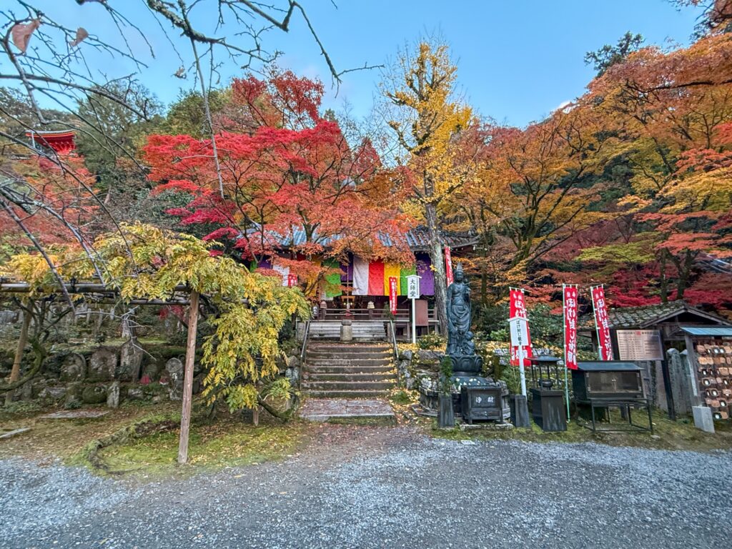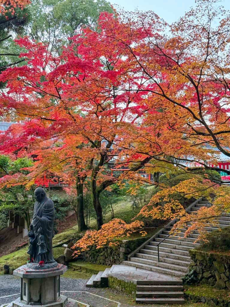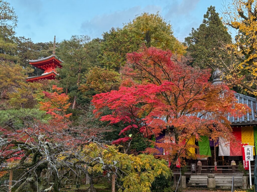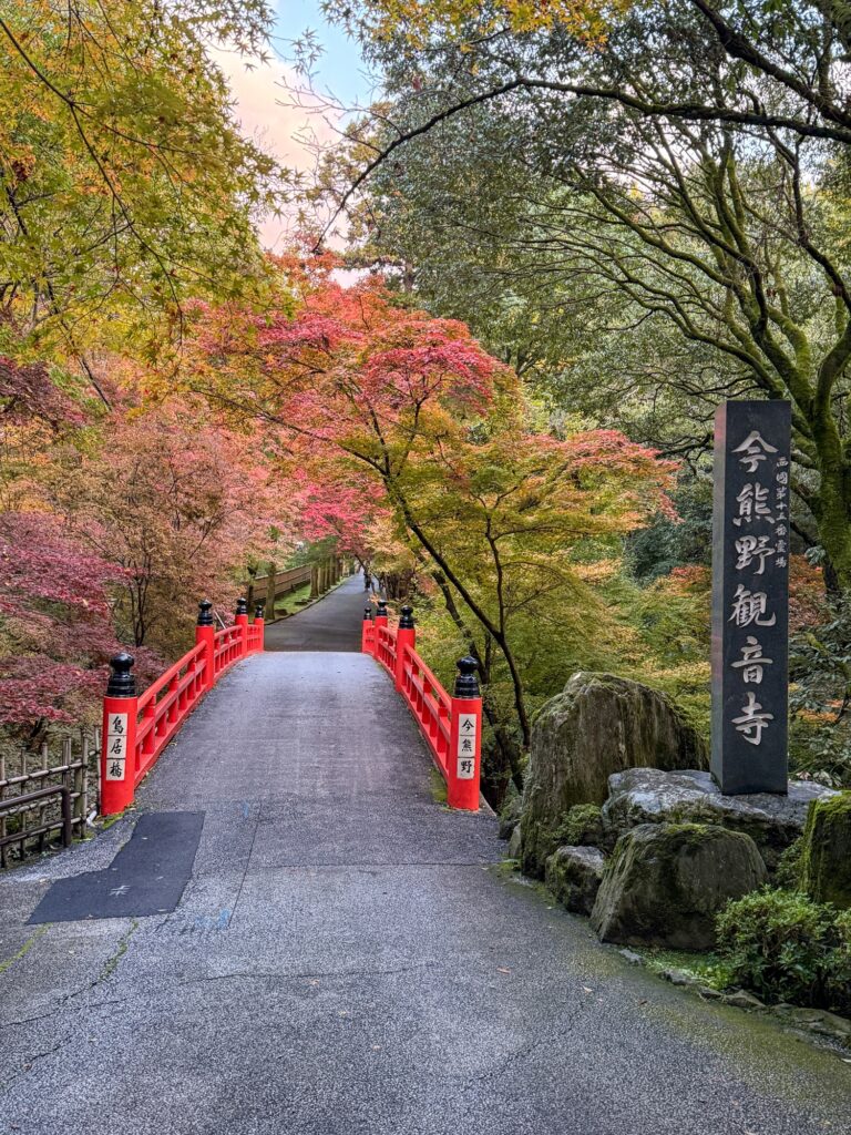 今熊野観音寺は、東山の静かな穴場の紅葉名所で、境内一帯を約2000本ともいわれるモミジがあります。 朱色の鳥居橋から本堂へ続く参道や、多宝塔・医聖堂周辺では、深紅から橙、黄緑へとグラデーションが美しいところです。