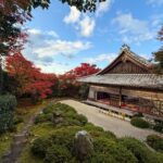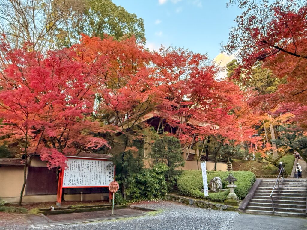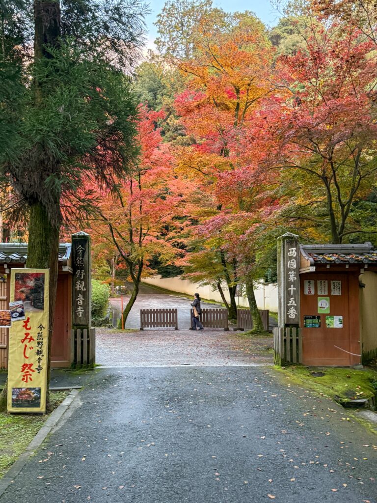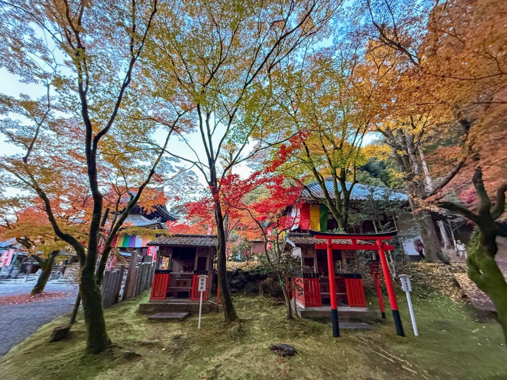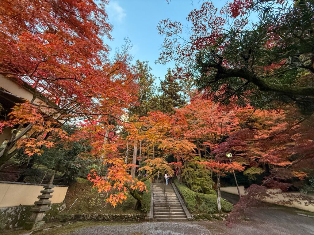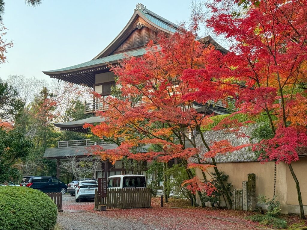今熊野観音寺は、東山の静かな穴場の紅葉名所で、境内一帯を約2000本ともいわれるモミジがあります。 朱色の鳥居橋から本堂へ続く参道や、多宝塔・医聖堂周辺では、深紅から橙、黄緑へとグラデーションが美しいところです。