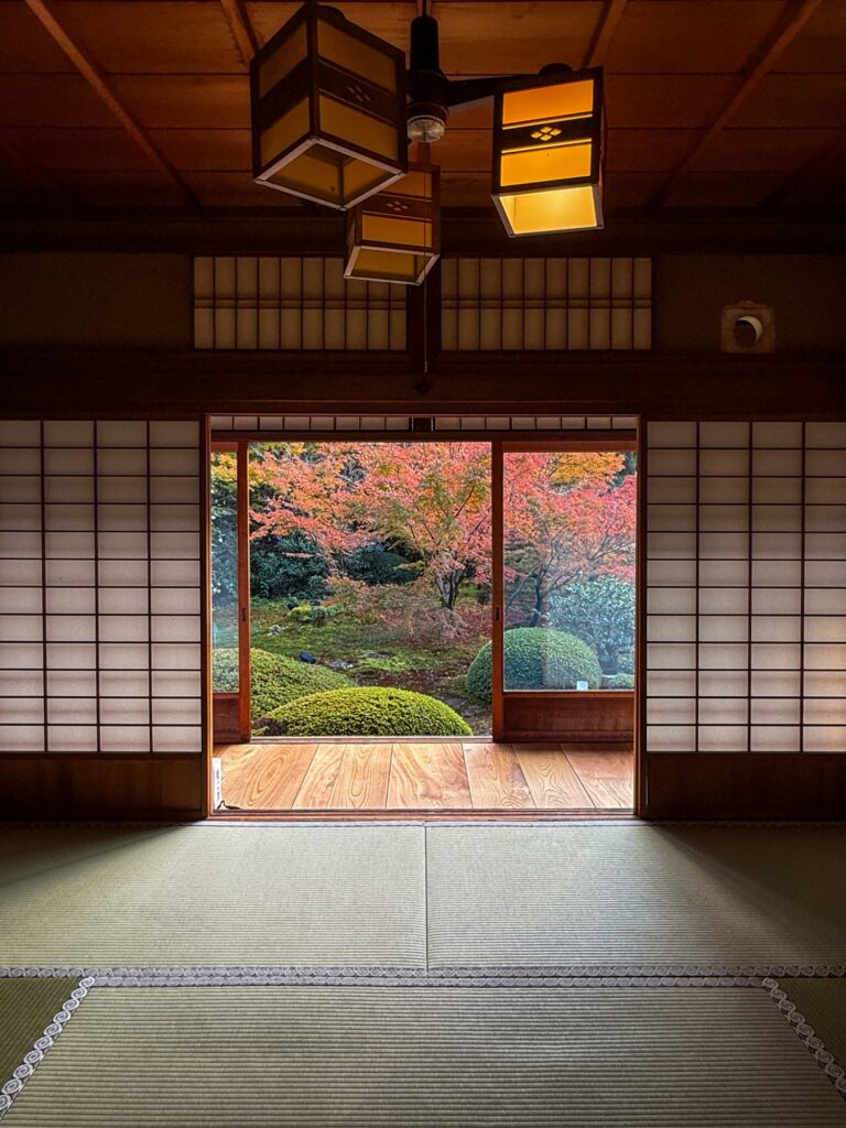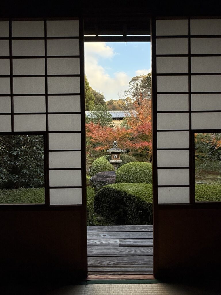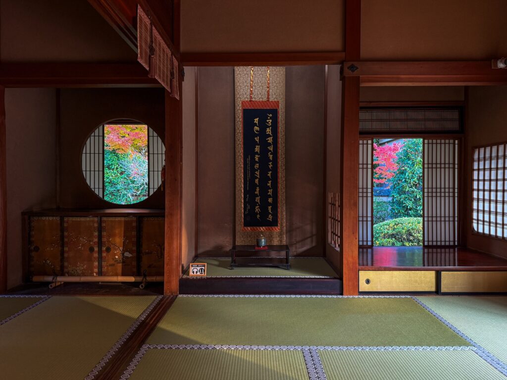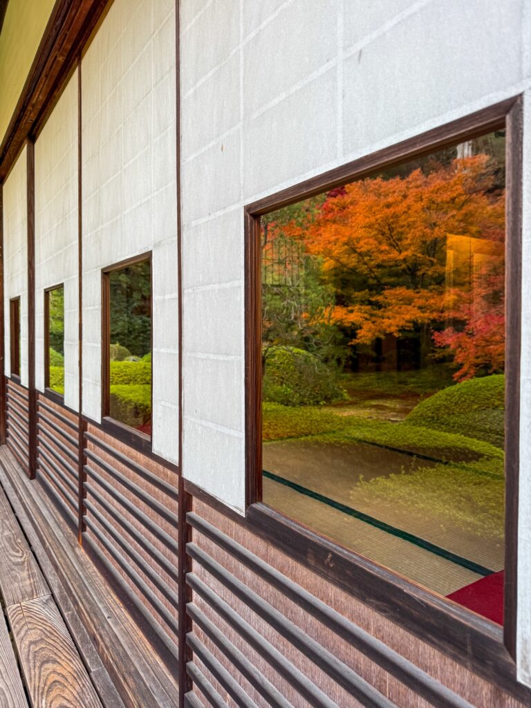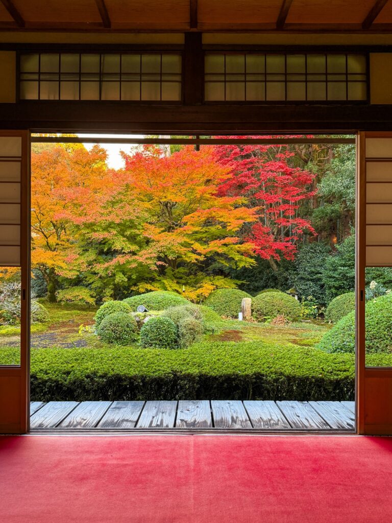 雲龍院は泉涌寺近くにあり「蓮華の間」にある、四つの雪見障子の窓が横一列に並びます。左から椿、石灯籠、紅葉、松がそれぞれ1枚の絵のように切り取られ、「色紙の窓」とも呼ばれる景色をつくります。小さな四つの窓を通して、移ろう四季や心の静けさをゆっくり味わえます。座る位置を少し変えるだけで景色が変わり、訪れるたびに違う表情に出会えます。