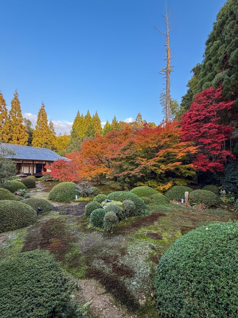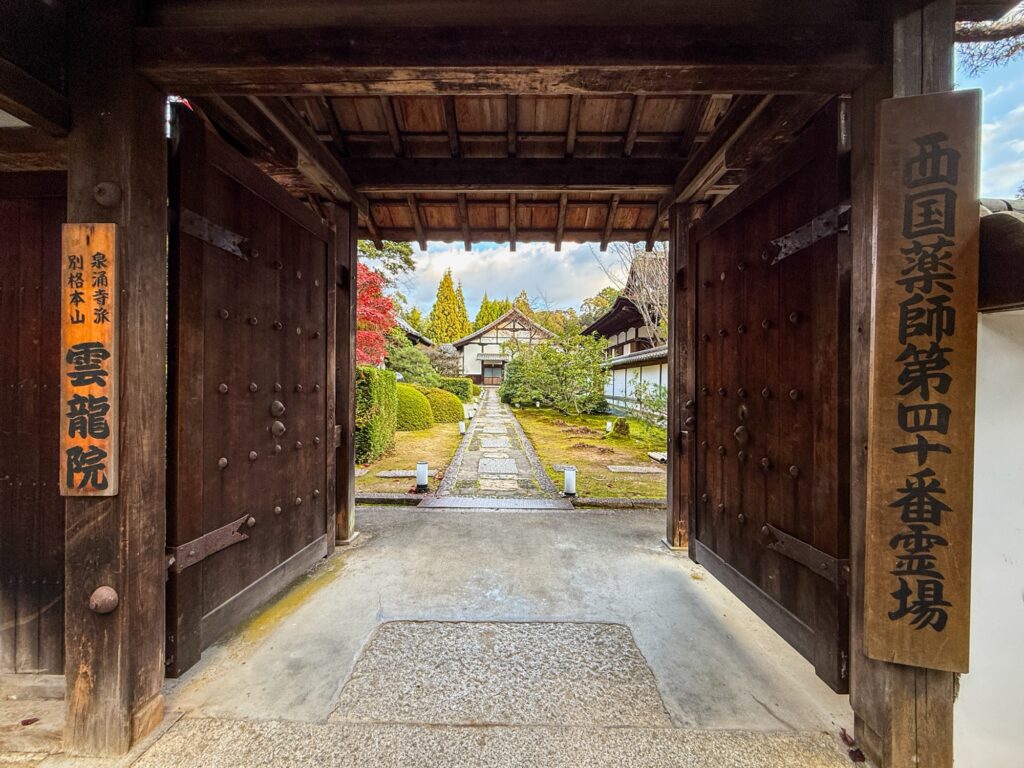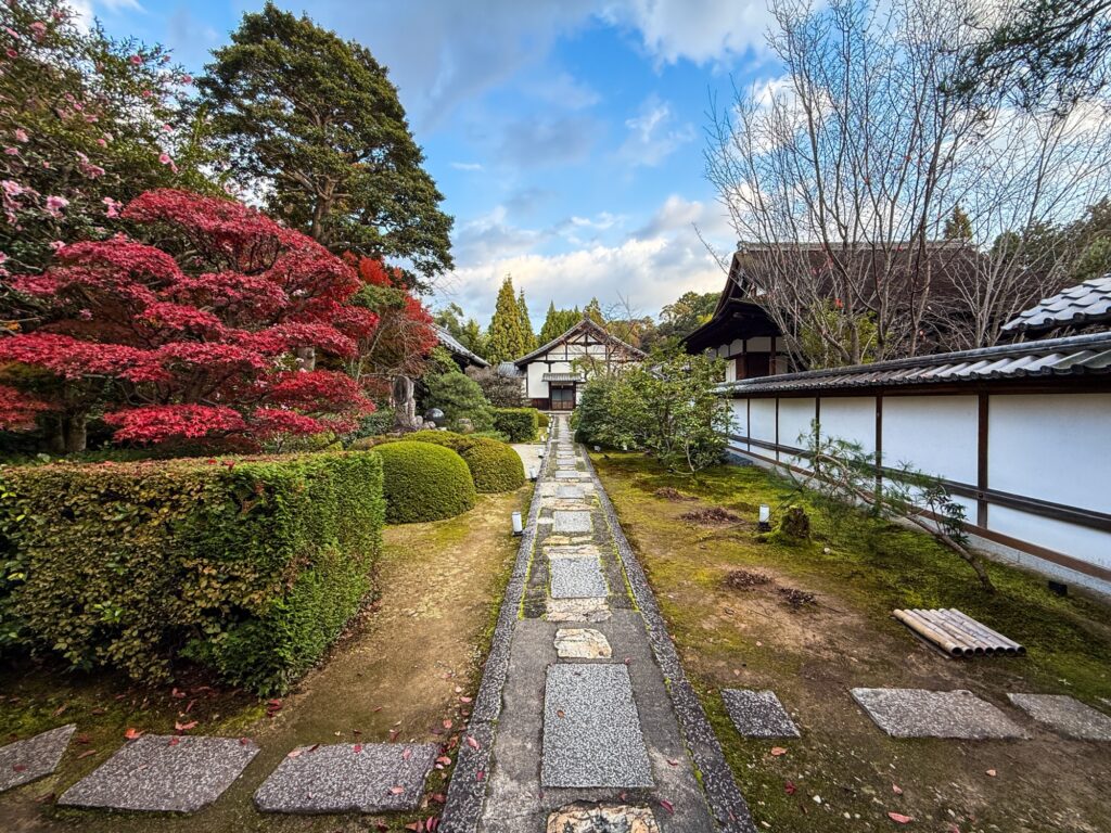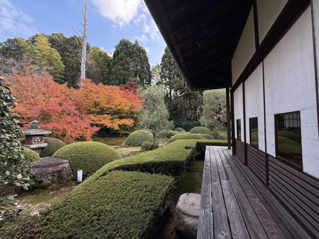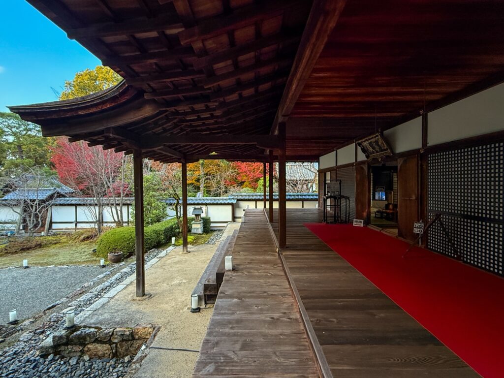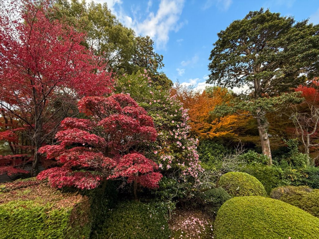雲龍院は泉涌寺近くにあり「蓮華の間」にある、四つの雪見障子の窓が横一列に並びます。左から椿、石灯籠、紅葉、松がそれぞれ1枚の絵のように切り取られ、「色紙の窓」とも呼ばれる景色をつくります。小さな四つの窓を通して、移ろう四季や心の静けさをゆっくり味わえます。座る位置を少し変えるだけで景色が変わり、訪れるたびに違う表情に出会えます。