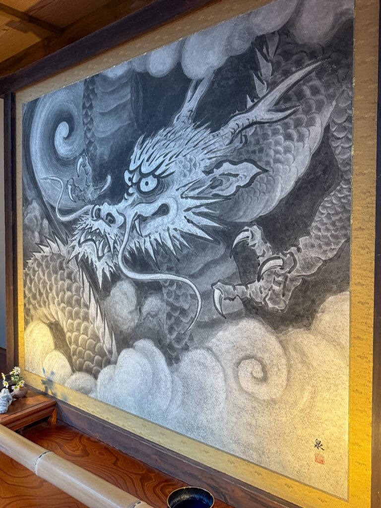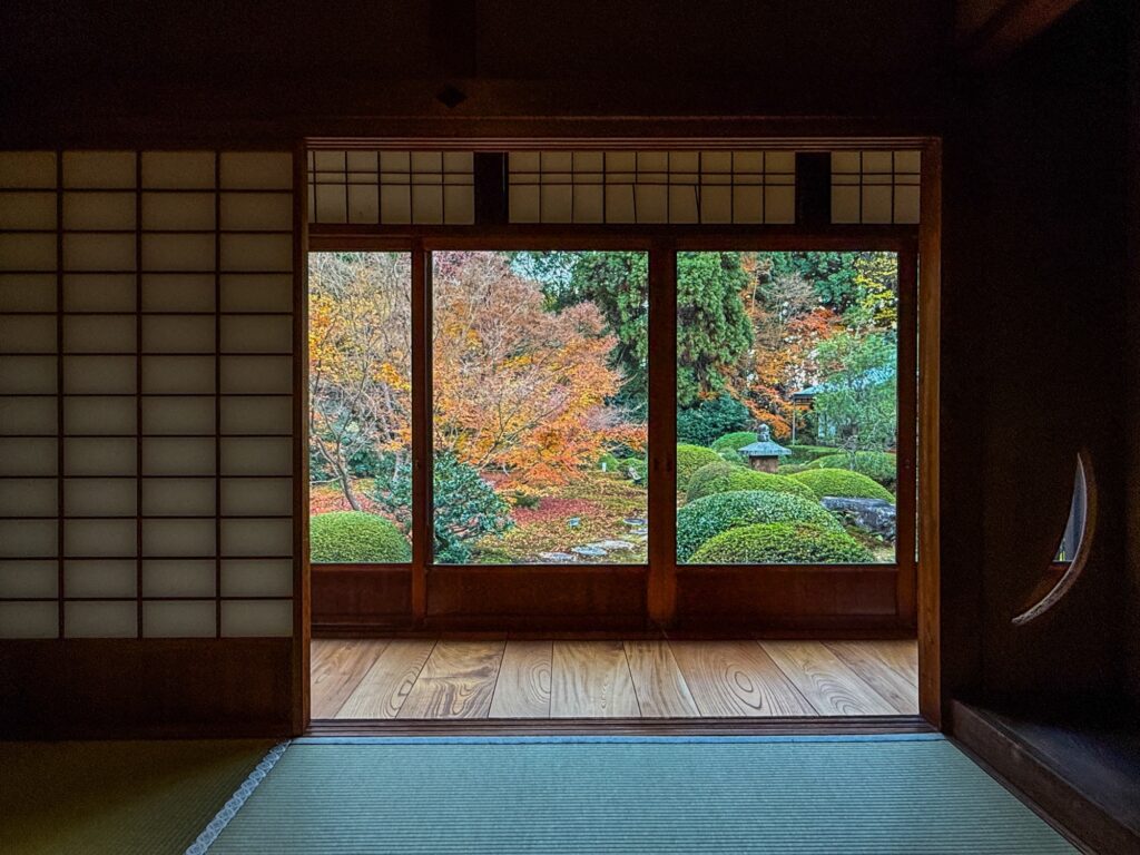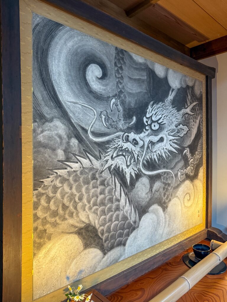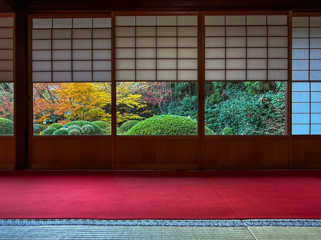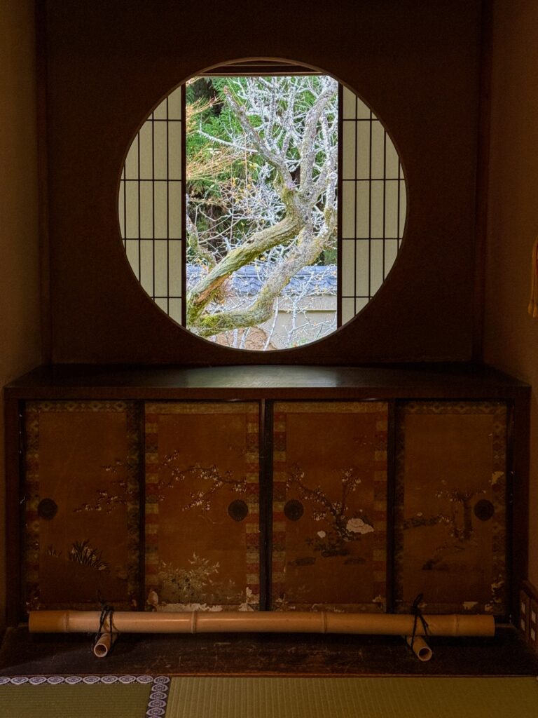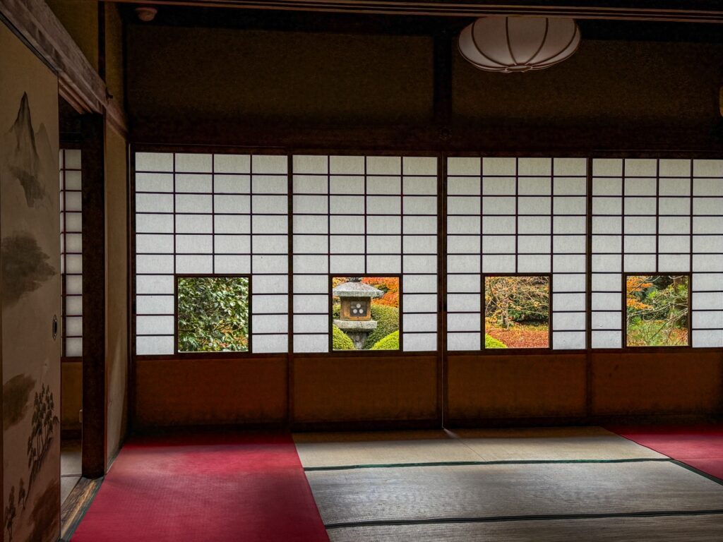 雲龍院は、京都・泉涌寺の別院で、皇室ゆかりの静かな禅寺です。泉涌寺山内の最奥に位置し、書院の「悟りの窓」と「迷いの窓」が有名です。雲龍院の玄関近くに掲げられた龍の水墨画は、遠近法の仕掛けがあり、だまし絵のように描かれ、左から右へ視線を移すと鼻(顔)の長さが異なり、龍の顔の印象が変化します。お隣の蓮華の間では「しきしの窓」があり、指定された場所に座ると、4つの雪見障子が椿、灯籠、楓、松の景色を切り取って見ることもできます。