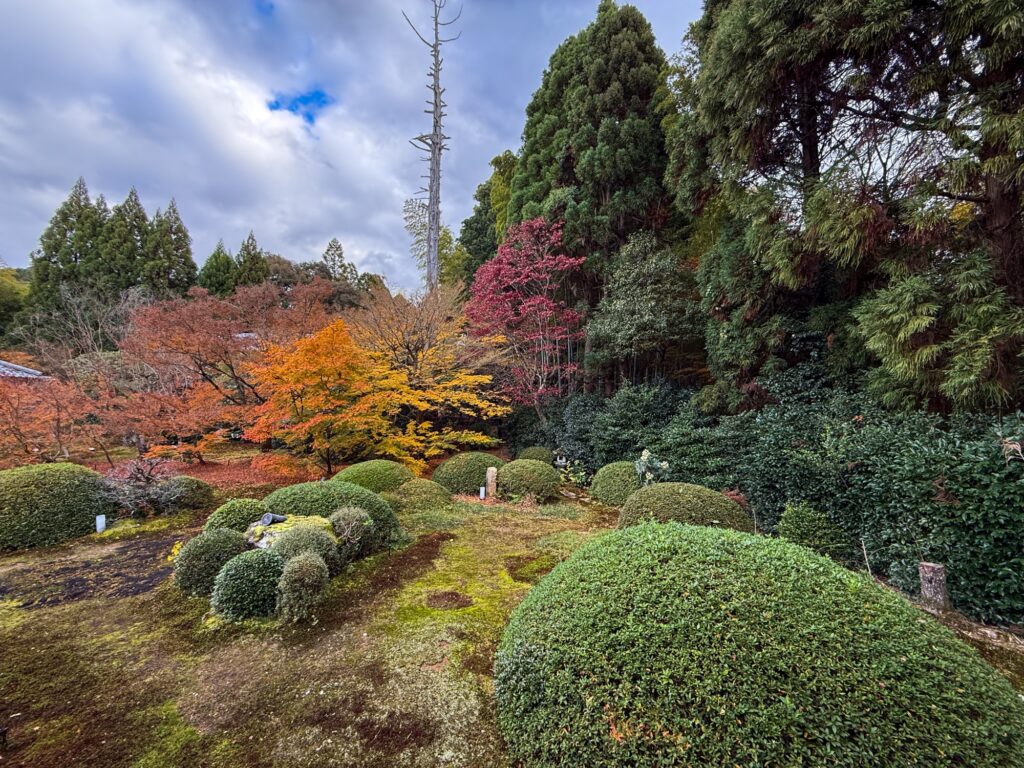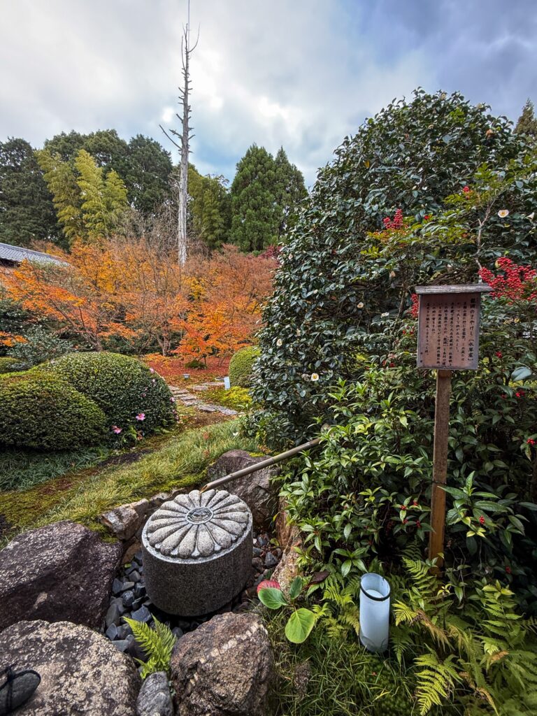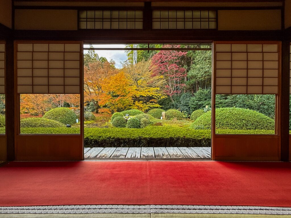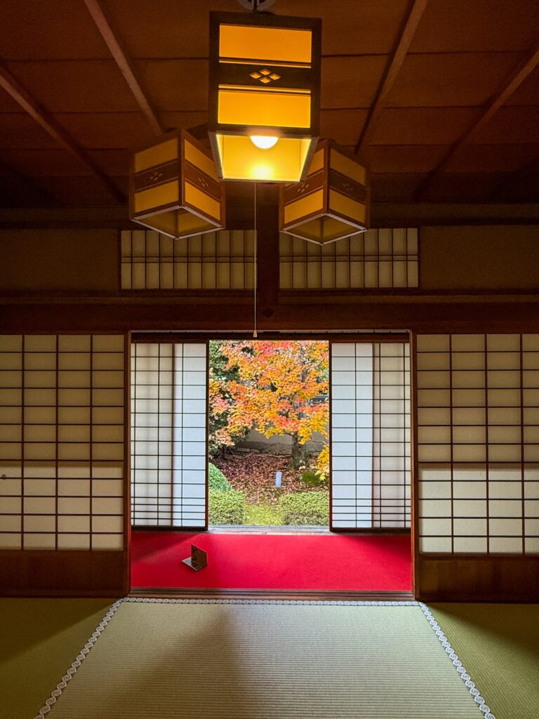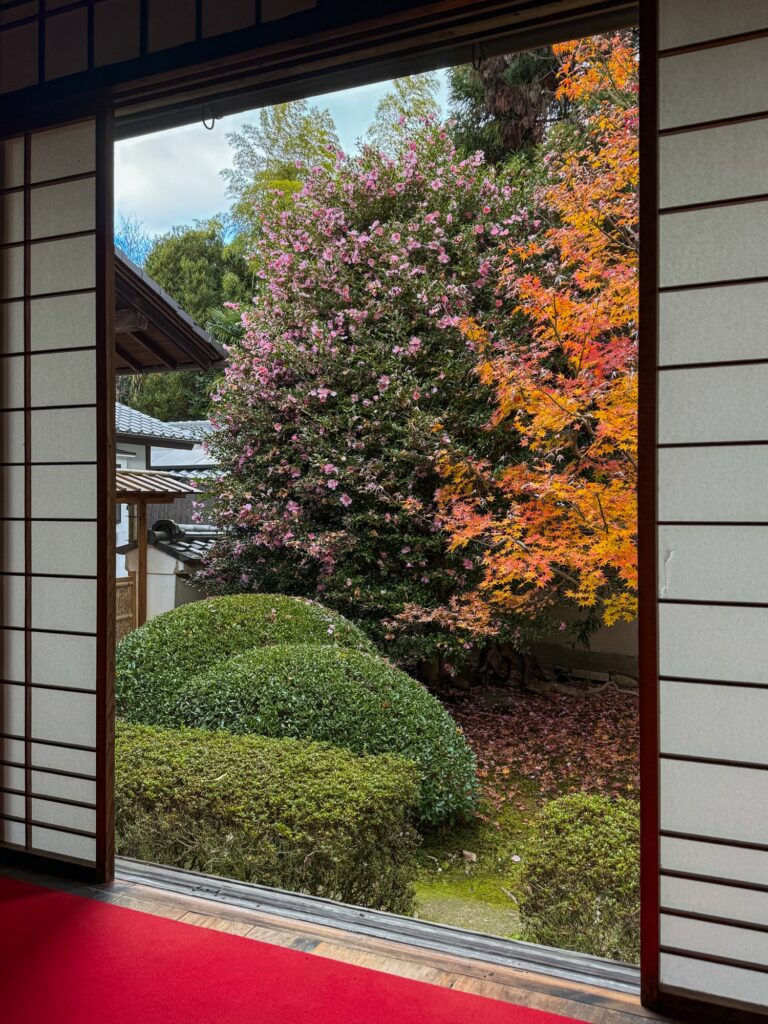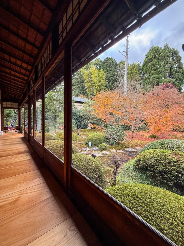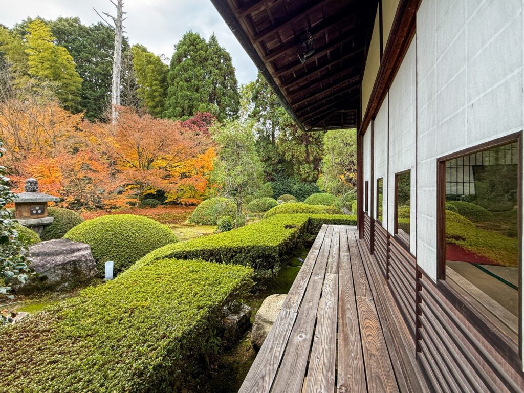 雲龍院は、京都・泉涌寺の別院で、皇室ゆかりの静かな禅寺です。泉涌寺山内の最奥に位置し、書院の「悟りの窓」と「迷いの窓」が有名です。雲龍院の玄関近くに掲げられた龍の水墨画は、遠近法の仕掛けがあり、だまし絵のように描かれ、左から右へ視線を移すと鼻(顔)の長さが異なり、龍の顔の印象が変化します。お隣の蓮華の間では「しきしの窓」があり、指定された場所に座ると、4つの雪見障子が椿、灯籠、楓、松の景色を切り取って見ることもできます。
