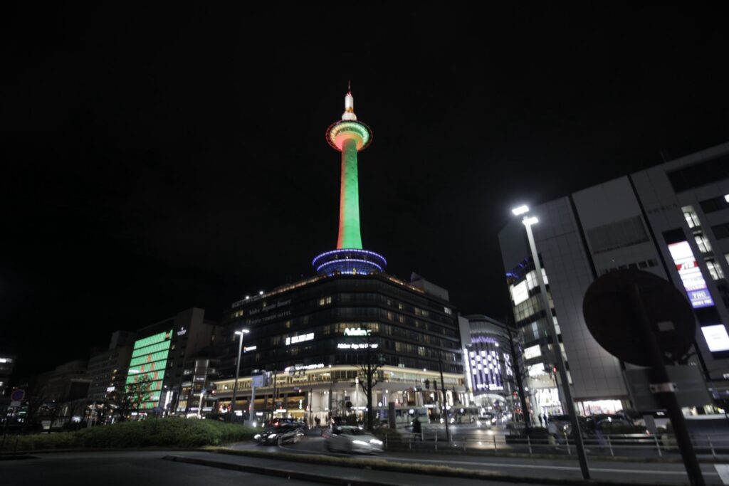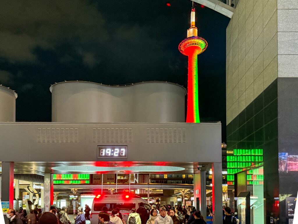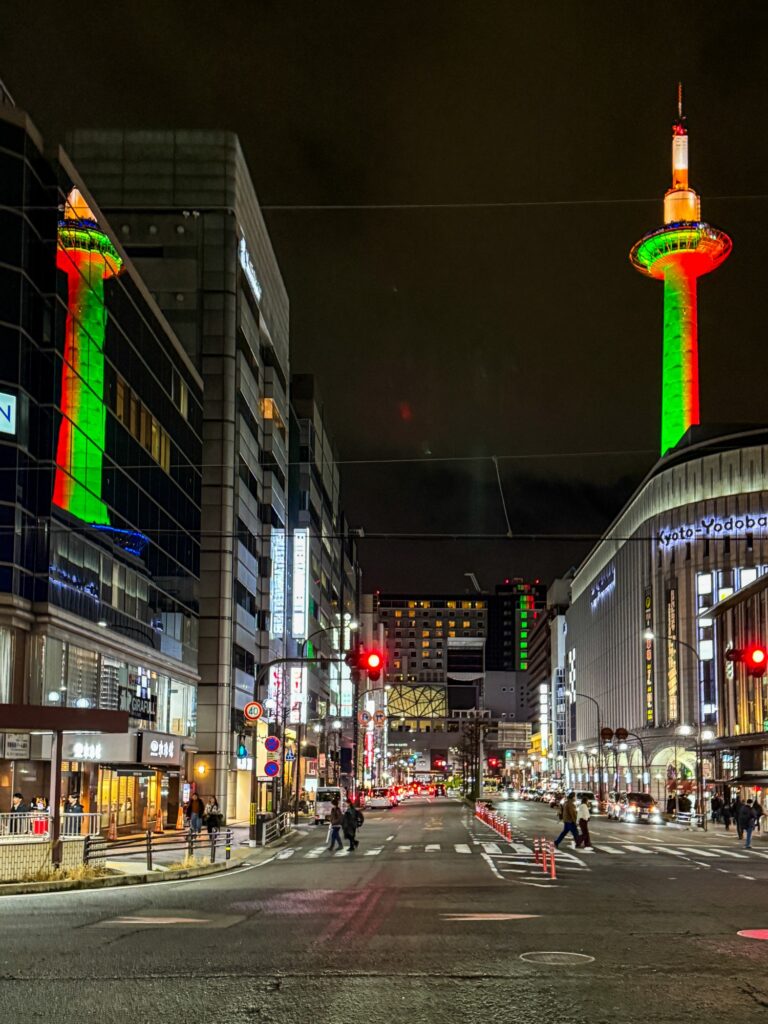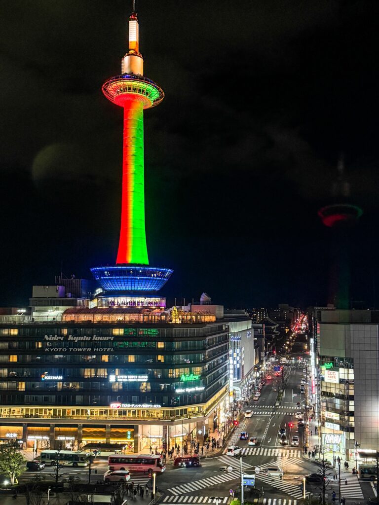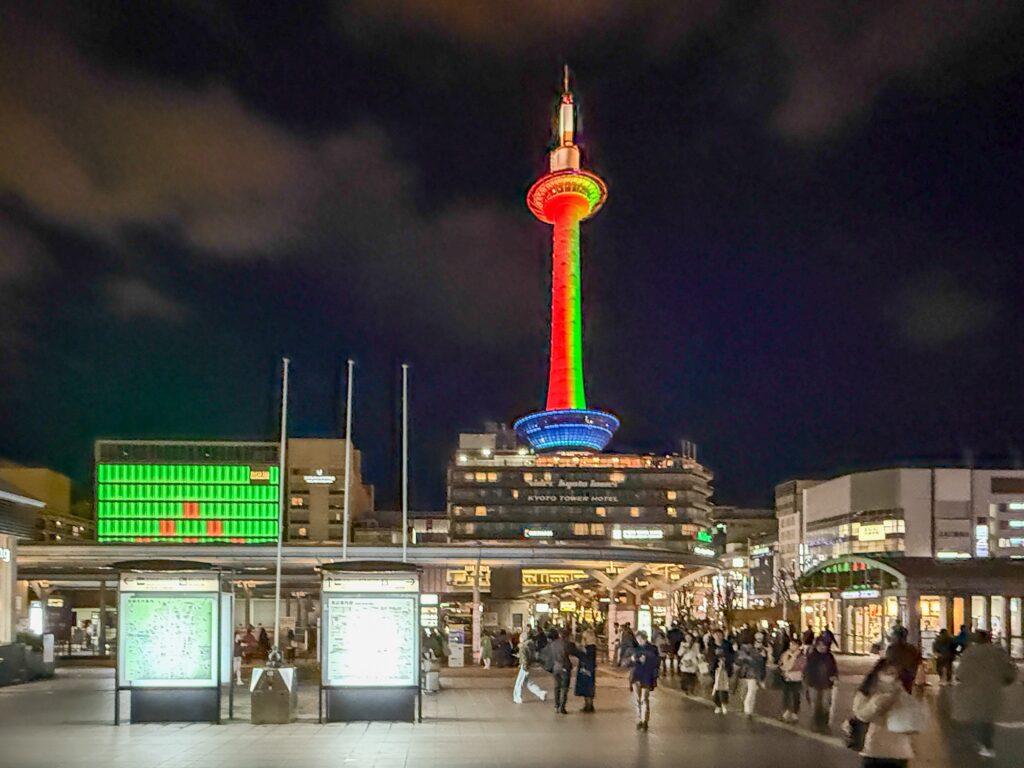 おでかけ京都2025年12月27日京都タワー クリスマス時期の12/24、25は京都駅周辺はクリスマスカラーのイルミネーションになります。 京都タワーは緑と赤 京都駅から見える風景は、この時期は特別感があります。 2025.12.24