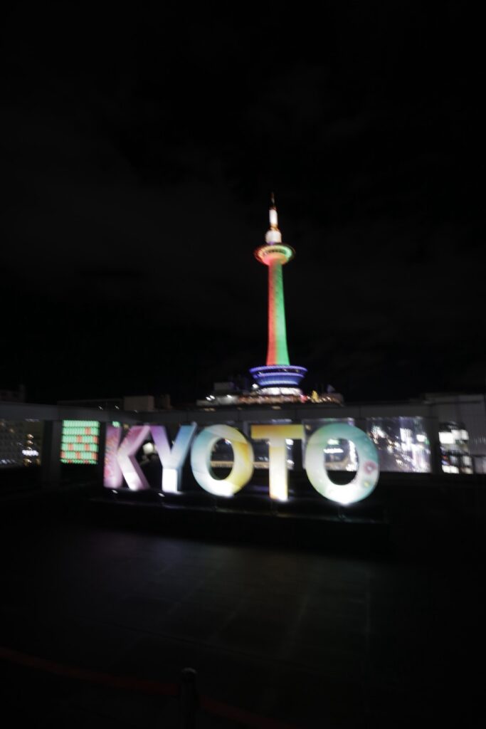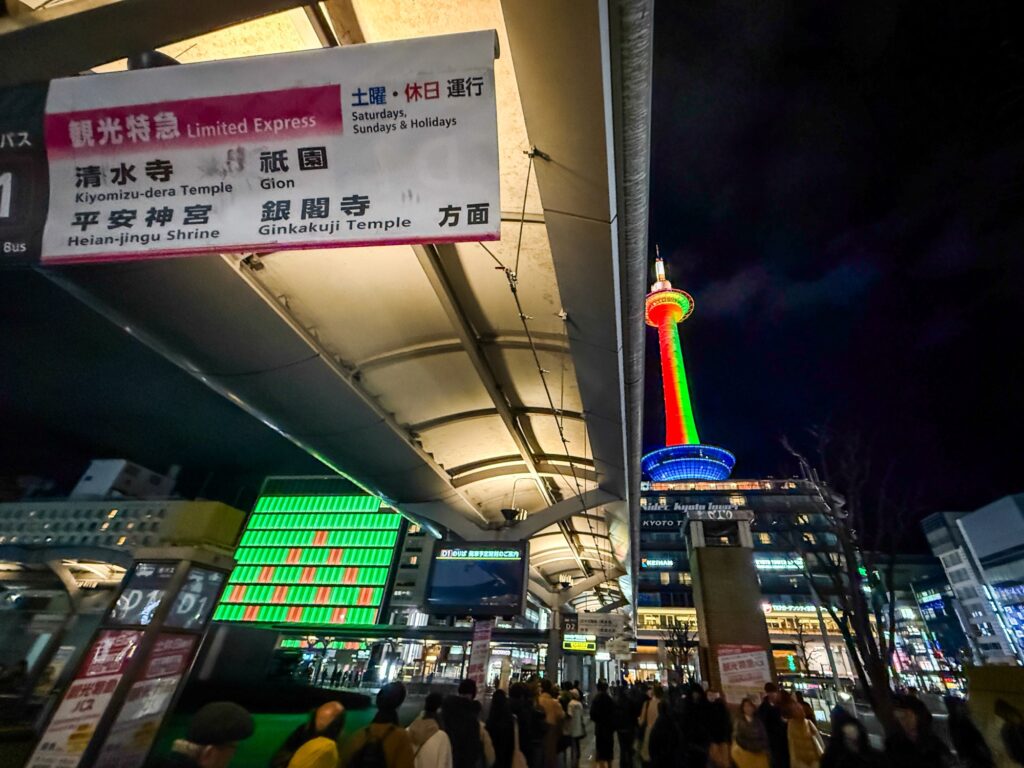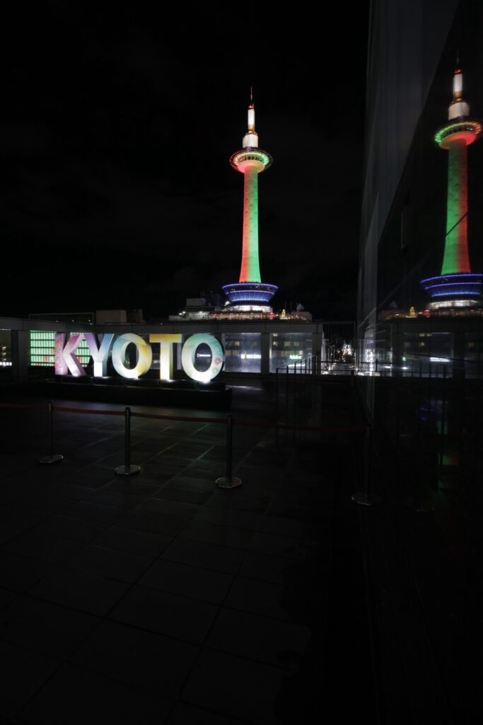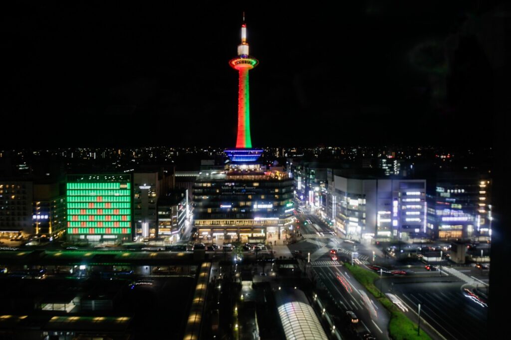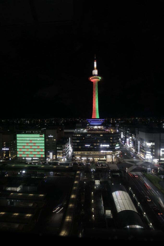 おでかけ京都2025年12月27日京都タワー クリスマス時期の12/24、25は京都駅周辺はクリスマスカラーのイルミネーションになります。 京都タワーは緑と赤 京都駅から見える風景は、この時期は特別感があります。 2025.12.24